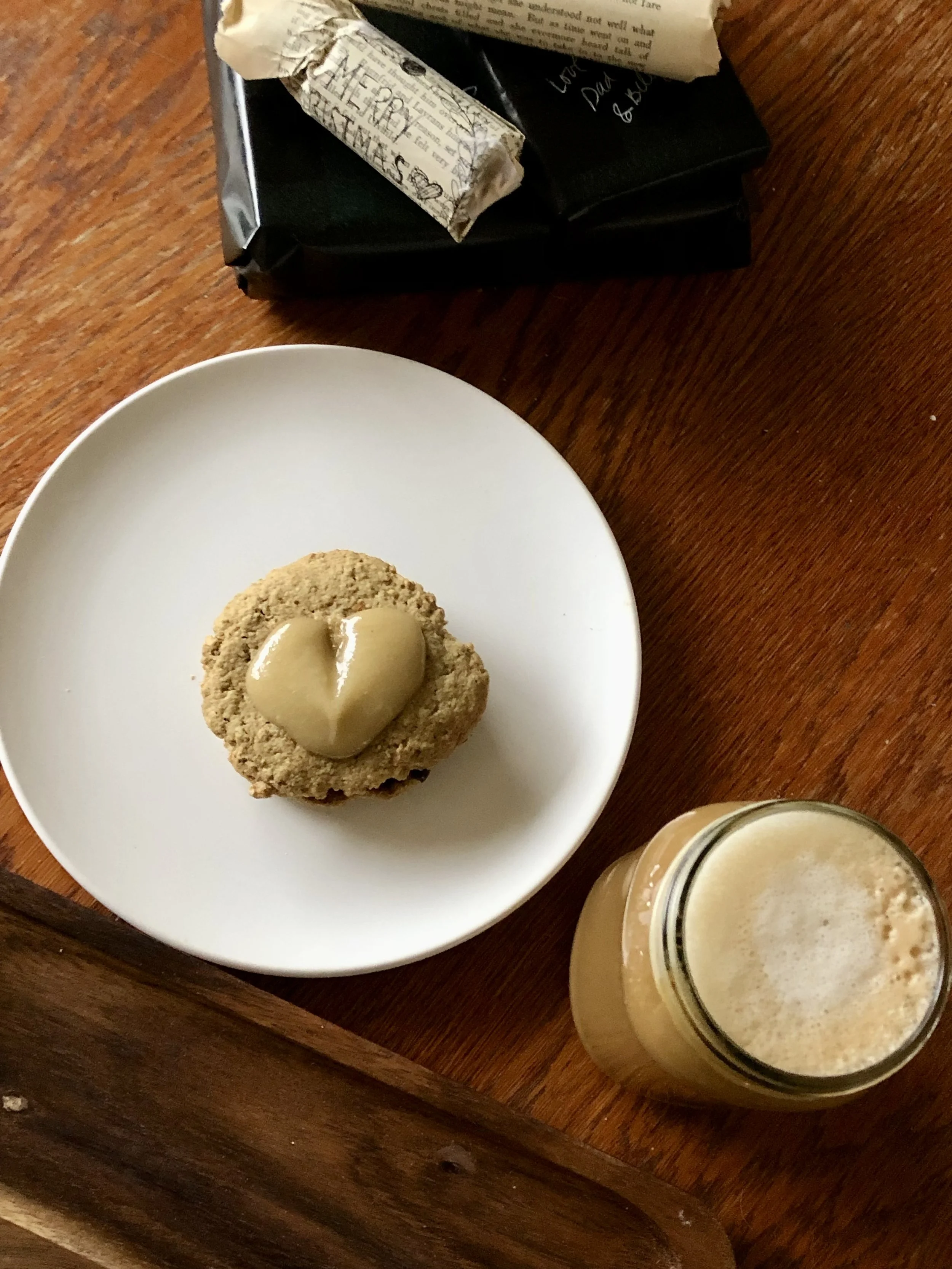 Next, prepare the cookies. Cream the butters and sugar well with a mixer. Add in the vanilla and almond extracts, then the chia eggs. Combine the dry ingredients in a separate bowl. Gradually add the dry ingredients to the wet ingredients and stir well. Roll into balls, flatten with the bottom of a glass and bake at 350F for 12 minutes. This recipe should make ~18-20 cookies.